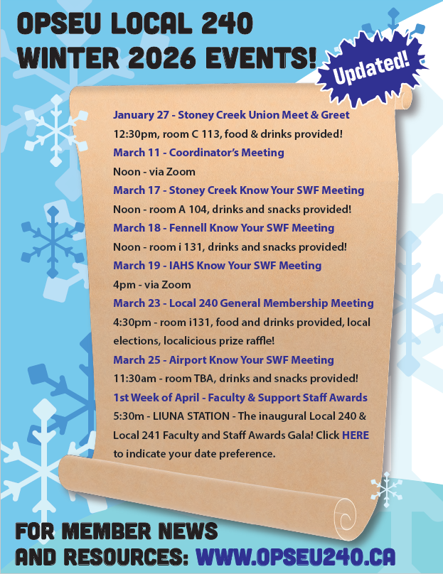Local 240 will hold several events throughout the year including General Membership Meetings (GMMs), social events and workshops. We will often provide food and refreshments at our meetings.